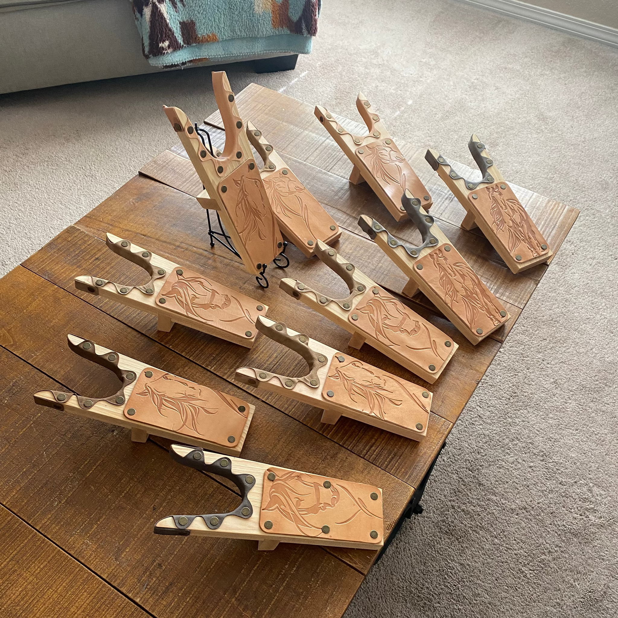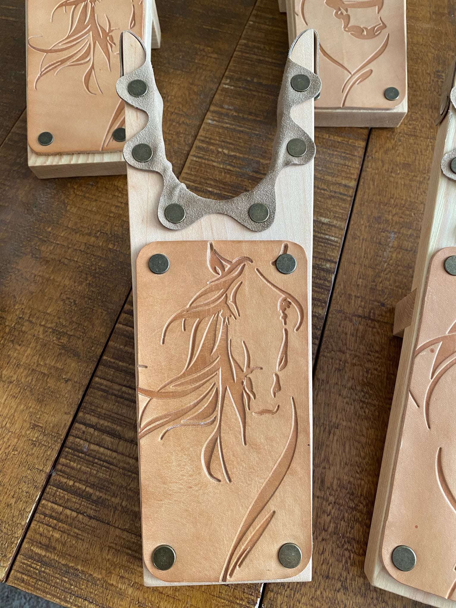 Treat yourself or surprise loved ones with this handcrafted boot jack with embossed leather, featuring individually hand-cut leather strips secured with nails and staples for a rustic, durable design.